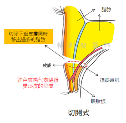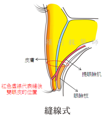 和縫線式的精神其實是一樣的,一樣必須有幾個點 (3-5個)縫到提眼瞼肌末端還有眼瞼板,然後再縫到皮膚,差別只在,傷口會順這上眼皮弧形切開,因為傷口有切開,因此可切除多餘下垂的皮膚,還可以處理過多的脂肪,可以製造較深邃的眼型!同時還可同時矯正提眼瞼肌無力的症狀!